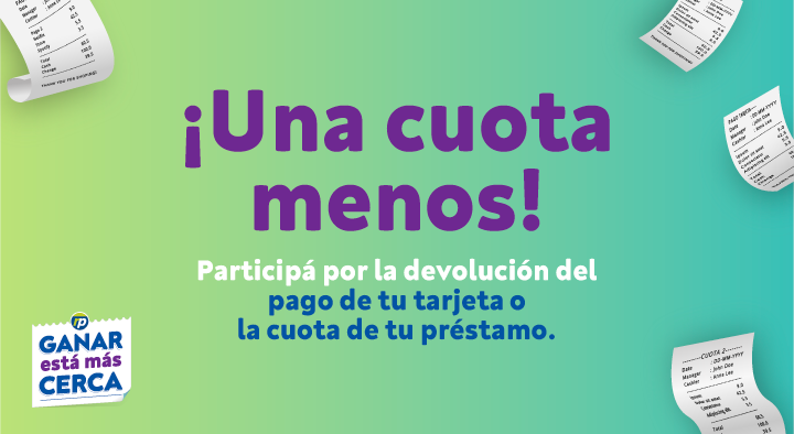 Podés ser uno de los ganadores de la devolución del importe que pagaste de tu tarjeta de crédito o la cuota de tu préstamo. Registrate acá y no te olvides de mencionar tu cédula cuando hacés el pago así generas las chances. ¡Hay 5 ganadores cada mes!